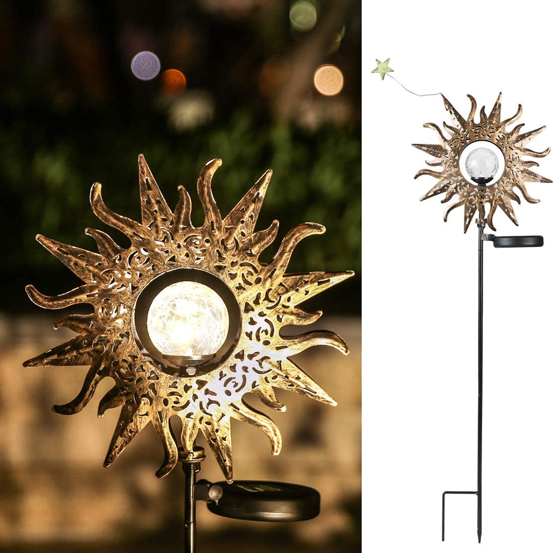 • 【BEAUTIFUL PATIO DECOR】: The solar landscape lights made of stainless steel and crackle glass ball, sun-shaped. With warm white LED design, and it can spin with the wind. The reflection of the pattern is very unexpected, bringing whimsical beauty to your garden and landscaping