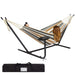 • Double hammock set comes complete with a 100% tightly woven cotton hammock, sturdy steel stand, and built-in accessory tray