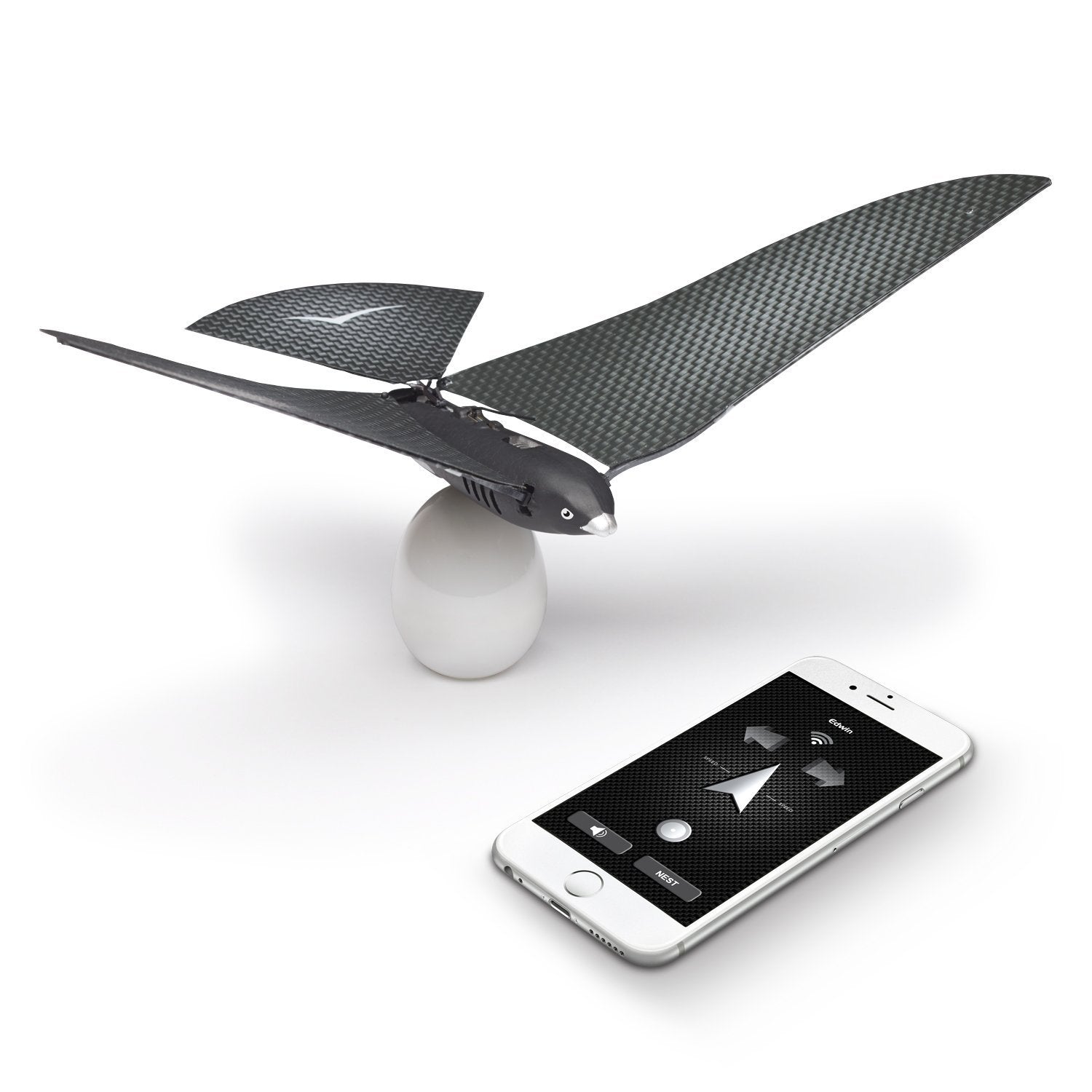• Box Content: 1 bird ready-to-fly, 1 QR code to download the free App, 1 egg (portative charger) to quickly charge the bird wherever you are, 2 spare wings, 1 USB cord to charge the egg, 1 packet of aluminium weights to balance wings.