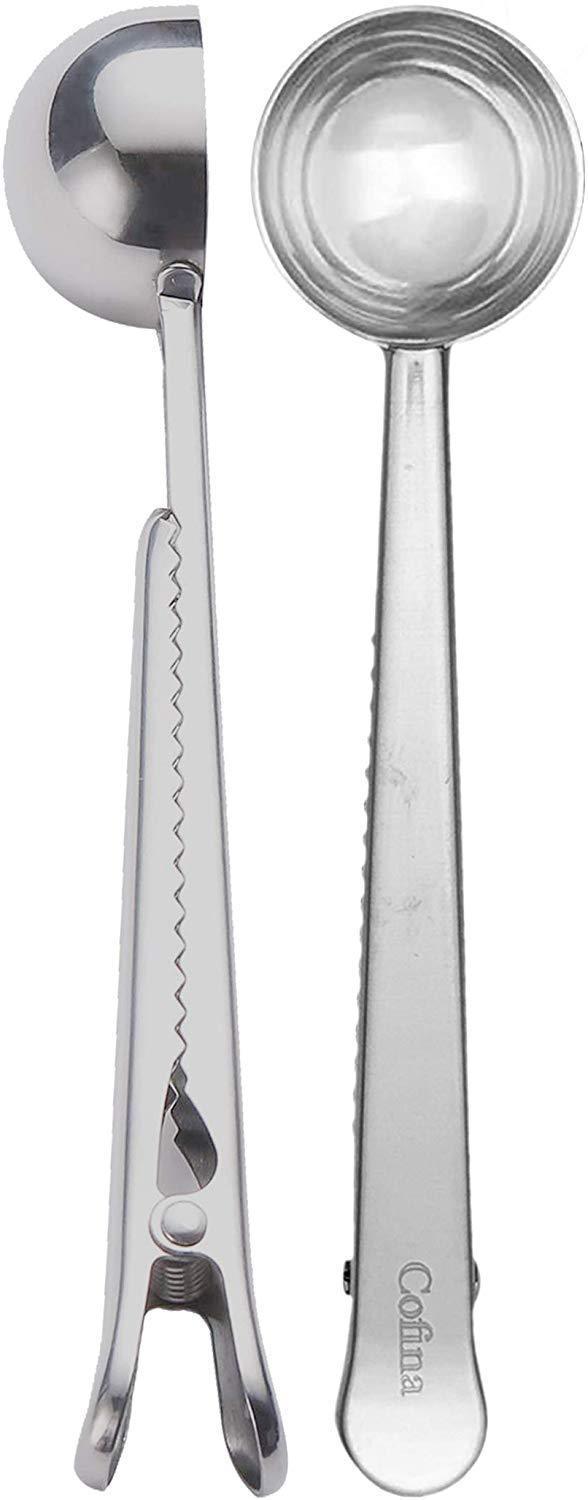 Cofina Coffee Scoop Measuring Spoon - Coffee Spoon with Clip, stainless steel tablespoon to close your coffee bags. Use One Scoop per Cup and seal your coffee bag