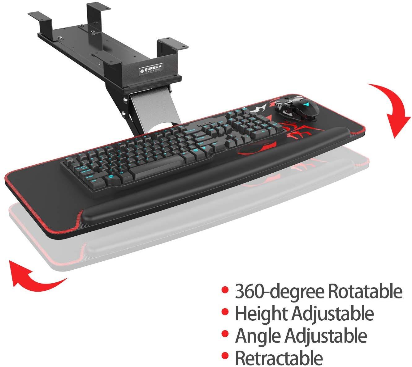 • ✔【ADJUSTABLE GAMING KEYBOARD TRAY】-The Eureka Ergonomic adjustable gaming keyboard tray is the perfect upgrade for your gaming battle station or adjustable standing desk. This keyboard tray is fully adjustable. It can rotate left to right, tilt the keyboard angle up or down, adjust the keyboard tray up or down, and is retractable if you need to get closer to your monitor. The best way to know if you like it, is to try it for yourself.
