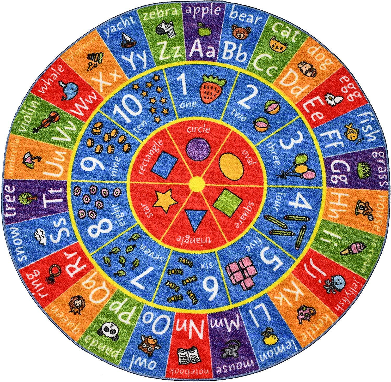 KC Cubs Playtime Collection ABC Alphabet, Numbers and Shapes Educational Learning & Game Area Round Circle Rug Carpet for Kids and Children Bedrooms and Playroom