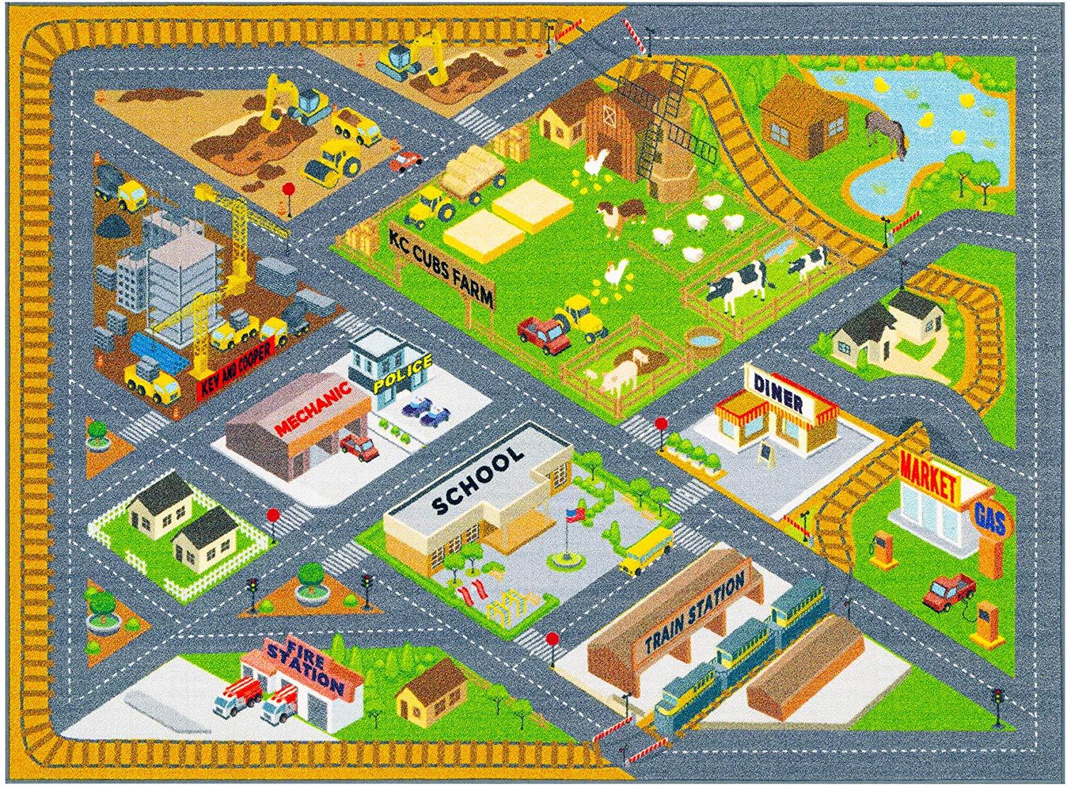 KC Cubs Playtime Collection Country Farm Road Map with Construction Site Educational Learning Area Rug Carpet for Kids and Children Bedroom and Playroom (5' 0" x 6' 6")