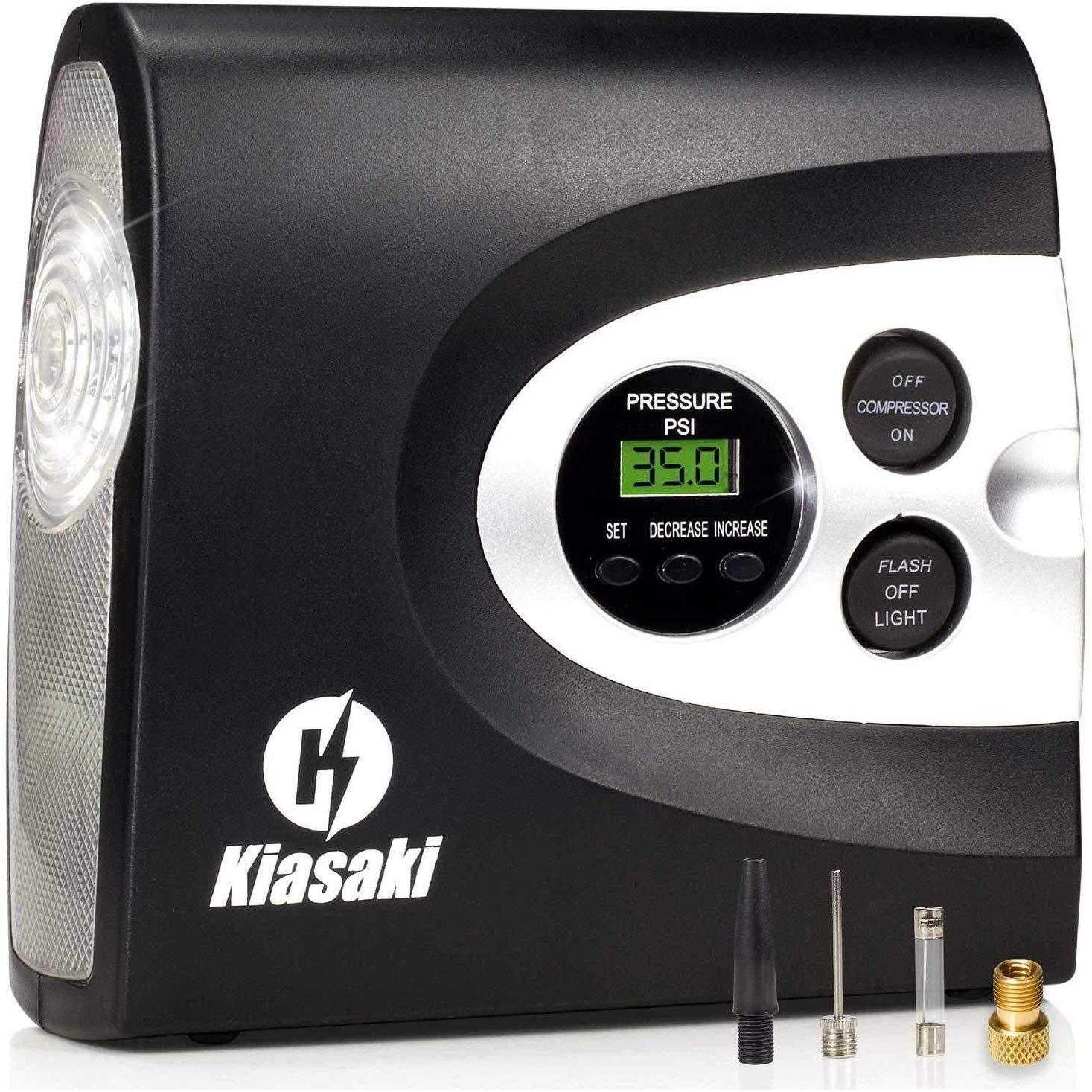 • ★【DIGITAL DISPLAY & LED LIGHTING】: The portable air compressor equipped with a large high-precision and bright display that will help you to calculate the required values PSI, BAR, KPA, KG/CM². Kiasaki digital tire inflator is equipped with bright and long-lasting LED lights, easy to use even in the dark, so you can see clearly while you're reinflating your tire at night or making quick repairs on a dark lonely country road.
