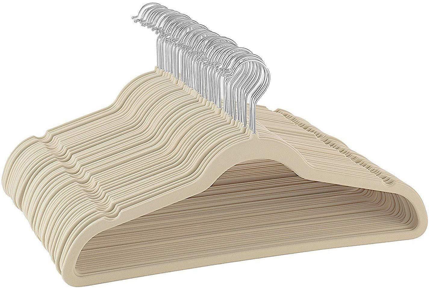 • 50 attractive Ivory velvet non slip hangers featuring 360 degree swivel, shiny, chrome hooks and notched shoulders that will make hanging clothes a simple pleasure!