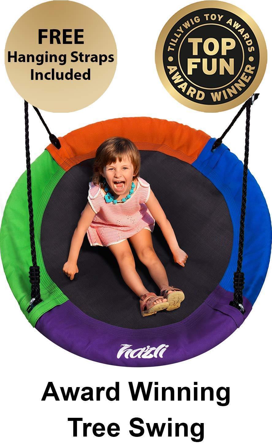 • ROUND TREE SWING FOR HOURS OF OUTDOOR FUN - The Hazli tree swings for outside are the perfect playing equipment for kids. The Hazli saucer swing for kids can fit children of different ages, weights, and heights and is very comfortable due to the large sitting space area. Add a colorful saucer tree swing to your backyard and enjoy watching you child develop balance and imaginative play by twisting and swinging all day