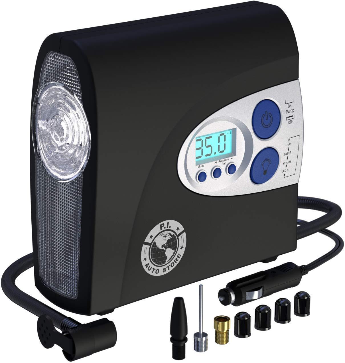P.I. Auto Store Premium Air Compressor Tire Inflator for Automobiles and Bikes. Portable 12V DC Electric Car Tire Pump, Auto Shut Off, Digital Pressure Gauge, LED Light. New Improved Version