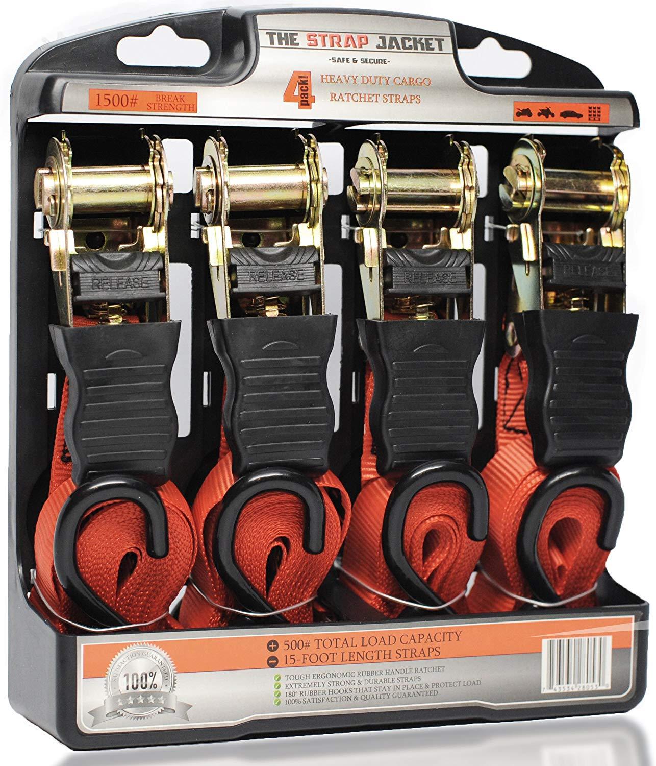 • BUILT STRONGER TO WORK HARDER- Constructed of heavy duty materials these ratchets are designed to out-perform all cheaper brands. We use our own products daily and we want you to have that same confidence. 100% Satisfaction is our goal. THE STRAP JACKET brand has Excellent Seller and Product Reviews for a reason! Ratchet straps are our specialty and consistent happy customers are what we strive for. 50 cents of every unit sold supports U.S. Military families through the NINE LINE FOUNDATION.