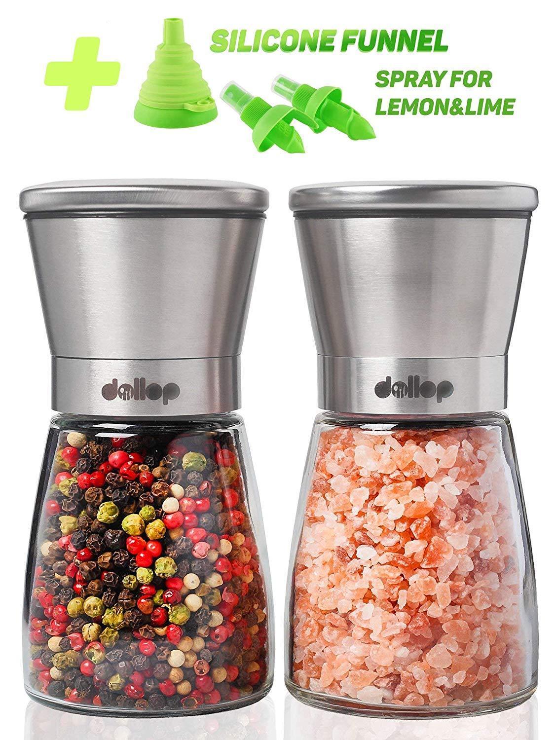 Salt & Pepper Grinder Set – Salt & Pepper Shakers with lid - brushed stainless steel Pepper Mill and Salt Mill - Adjustable Ceramic Rotor - Glass body - Silicone funnel collapsible & 2 citrus sprayer