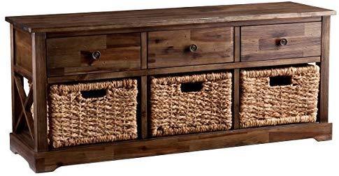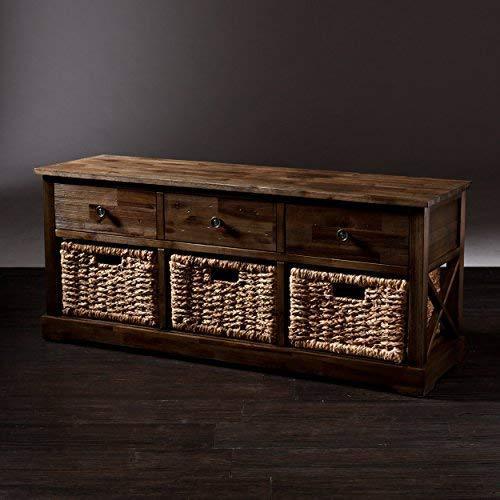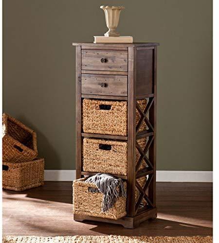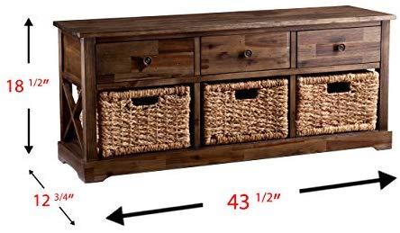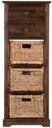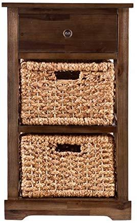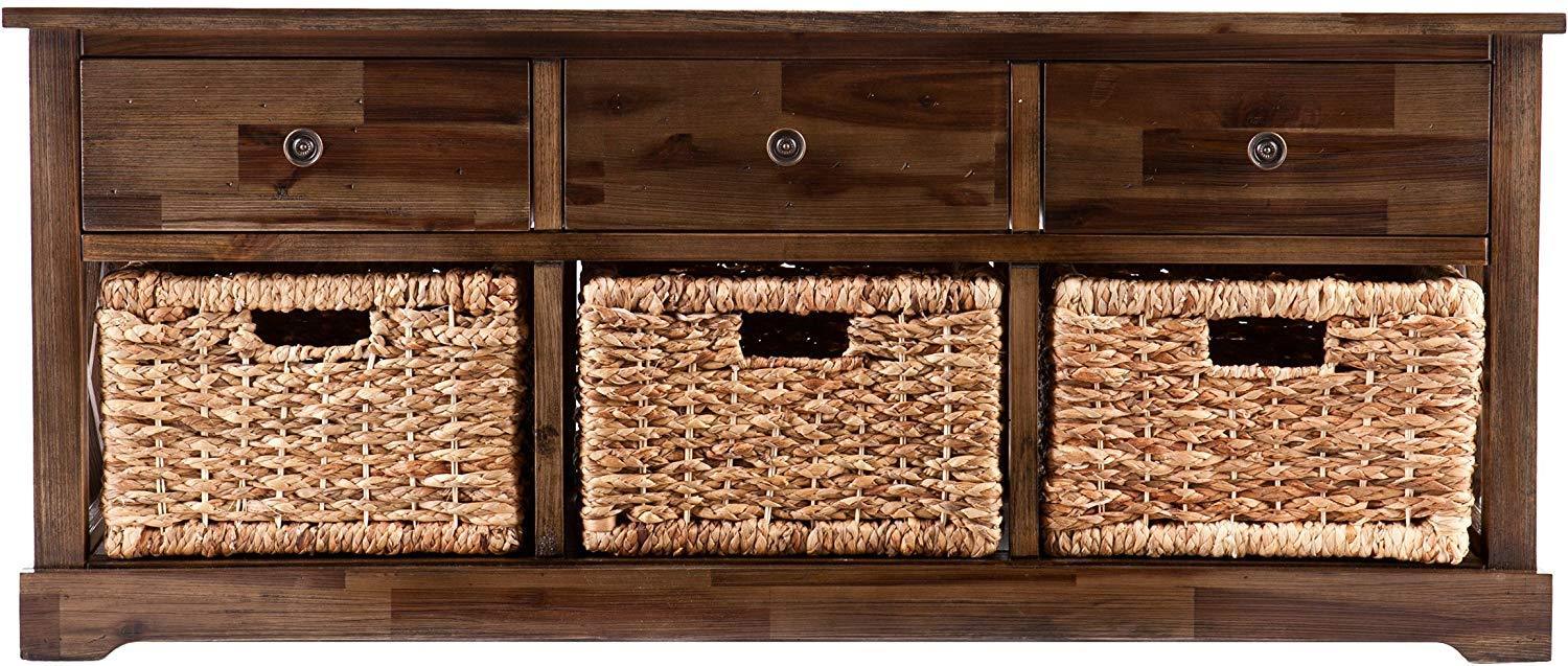 • Materials: acacia wood, MDF, acacia veneer, water hyacinth, metal; Supports up to: 10 lb. (top), 8 lb. (per drawer/basket); Approx. weight: 25 lb.
