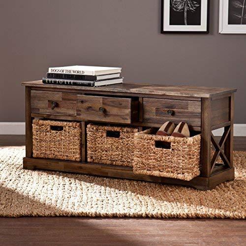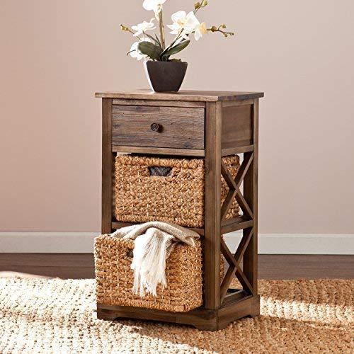 Features 1 drawer and 2 woven baskets; Removable baskets reveal optional shelf space Coastal style; Antiqued brown...