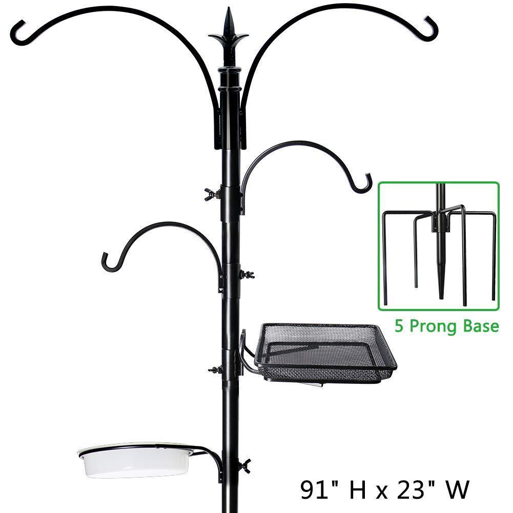• GREAT DESIGN - 5 Prongs for more stability than normal 3 prongs station kit. Bonus metal stake base adds stability and permits easy placement. Twin top level hooks allowed you hanging large bird feeders and other large hanging solar lanterns. Large water dish & seed tray are easy to fill and clean.