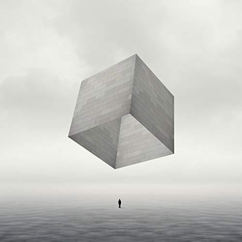 In this surreal scene, a giant, hollow cube made of bricks floats above a silhouette, standing on top of water. The black and white color scheme and serene nature reflects the signature style of contemporary photographer Philip McKay.