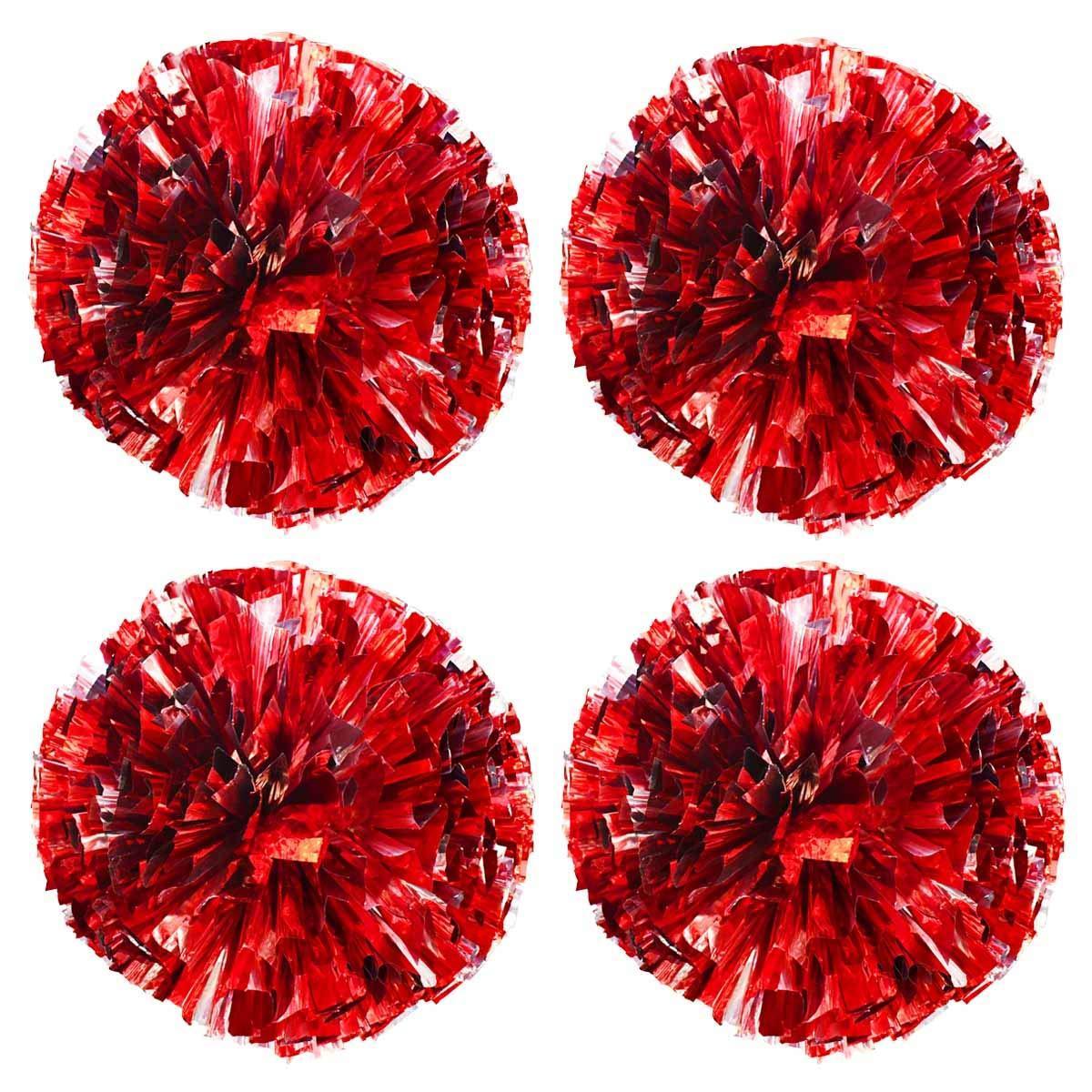 TTSAM 4 Pack (2 Pair) Metallic Foil Cheerleader Pom Poms & Plastic Ring Cheer Poms with Baton Handle Cheerleading Pompoms for Sports Party Dance Team Accessories Cheering Squad Spirit (Red & Silver)