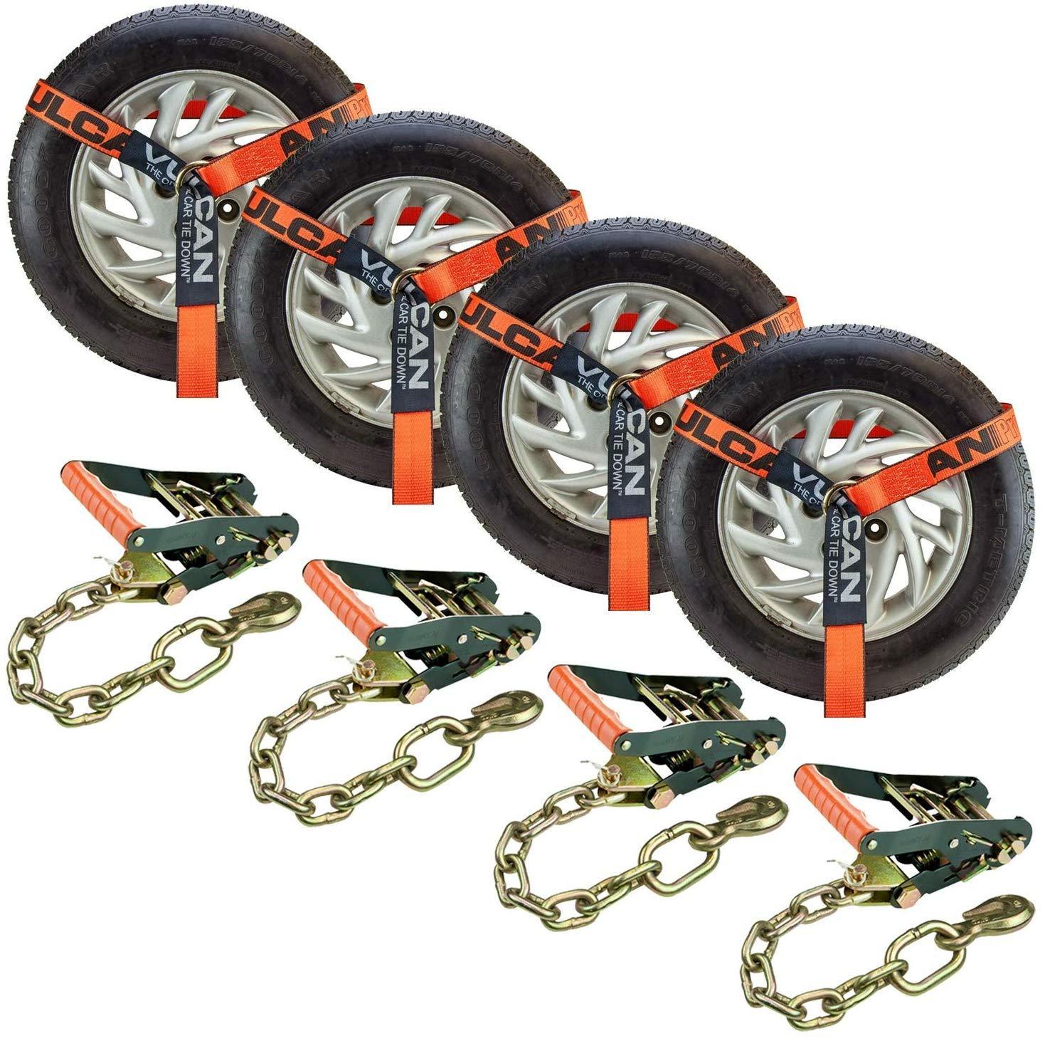 VULCAN ProSeries Orange 2 Inch x 96 Inch Lasso Auto Tie Down with Chain Anchors - 3300 lbs. Safe Working Load, 4 Pack - Easily Trailer Any Car, Truck, SUV, Jeep, Or Sportscar